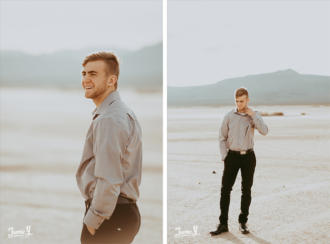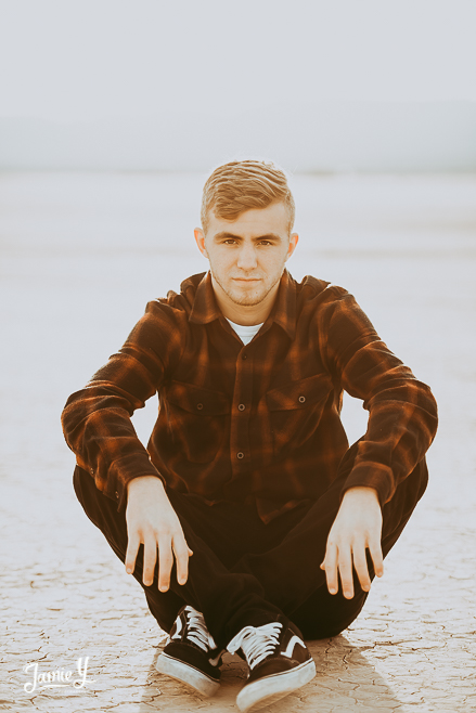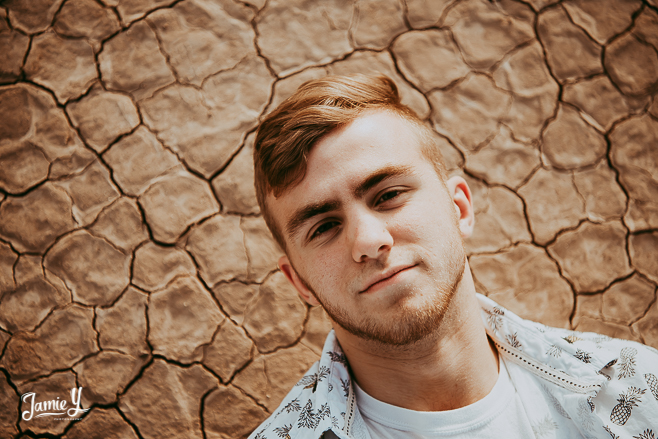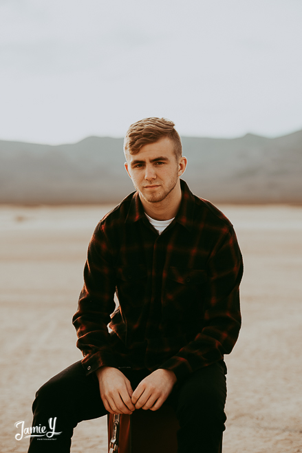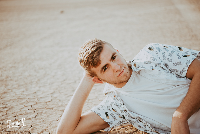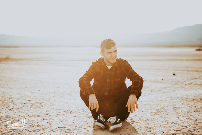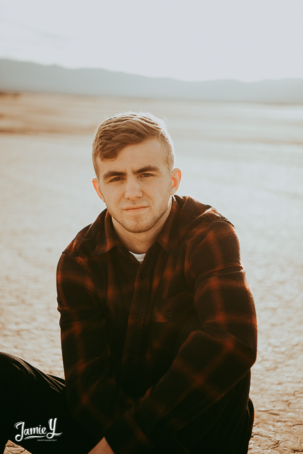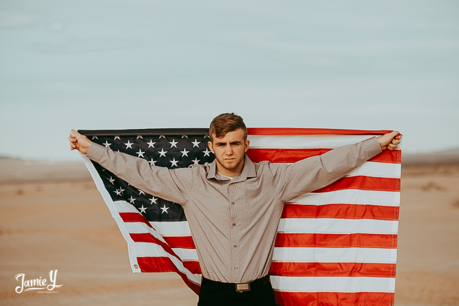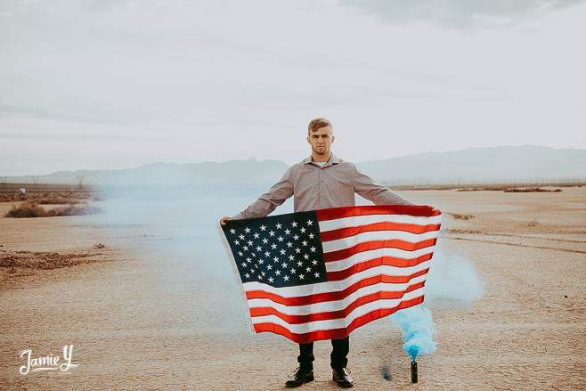 Today I am sharing these High School Senior Portraits in Las Vegas of Cole. Cole is graduating this year, class of 2018. Cole chose the dry lake bed for his senior session and it was a great choice. The dry lake bed is a great desert location choice and has beautiful light to go along with it. Cole is joining the Marines right after graduation! He brought a flag as a prop.