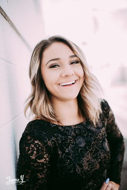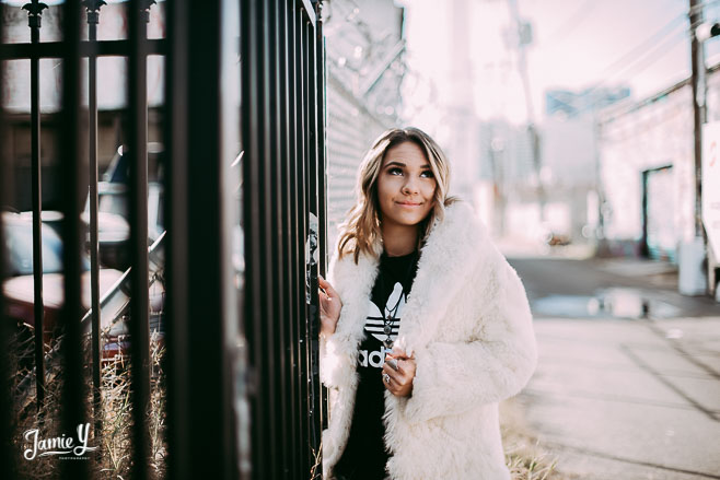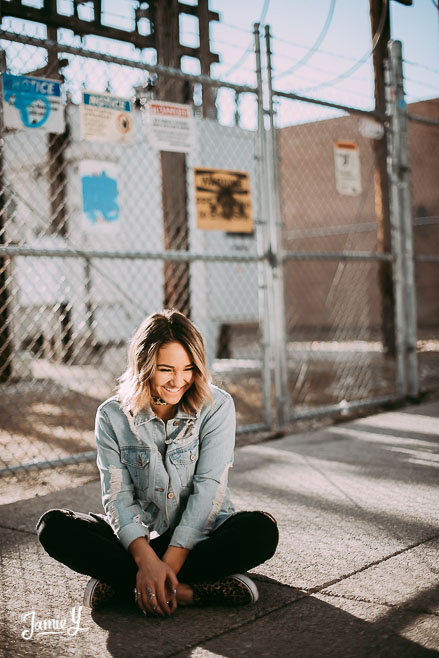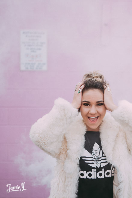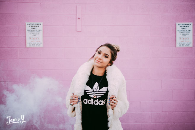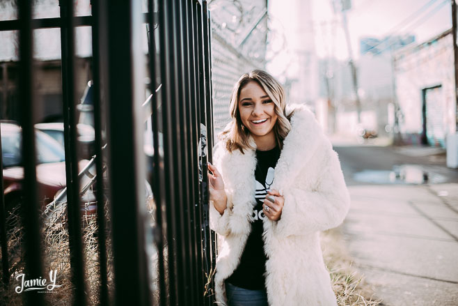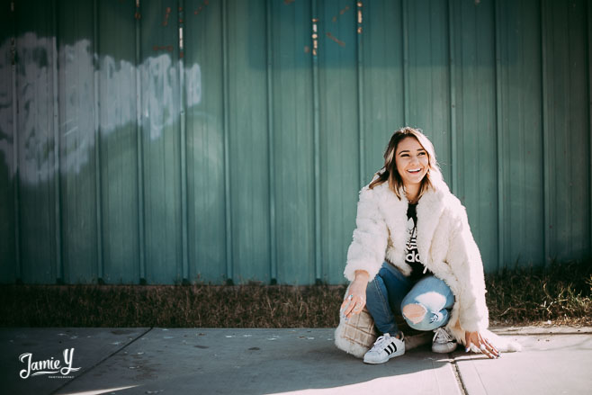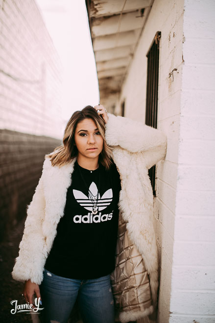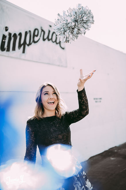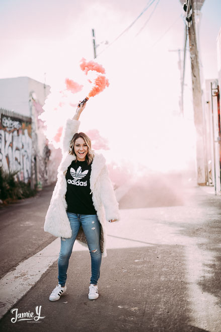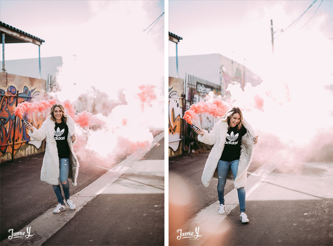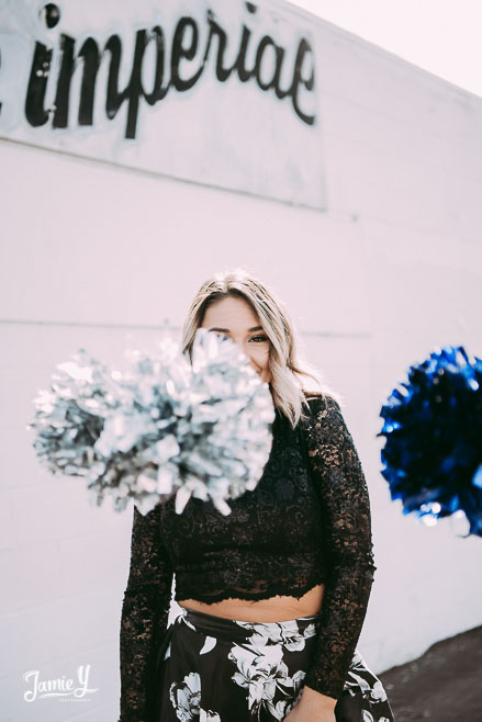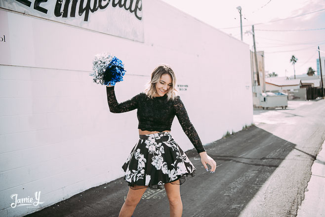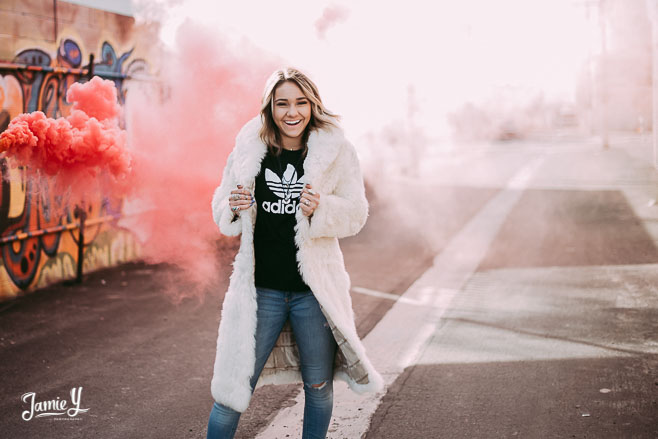 Kennady is a cheerleader so we incorporated some pom poms into her photos and we also had her wear her homecoming outfit for something a little more fancy. We used a smoke bomb in one of the alleys and she had a blast with it.